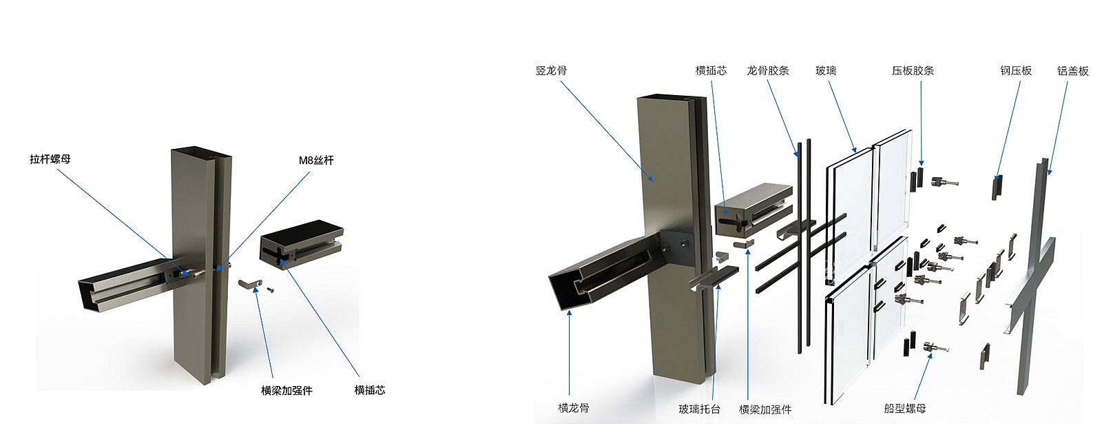 该幕墙框架系统为内扩台阶式拉铆结构,可实现框架层压式集约装配,具有很好的抗风压与防火隔热性能,且通过连接件与内扩台阶式拉铆结构的巧妙设计,实现幕墙系统的无孔、无损装配,大大降低了施工难度,并可实现断桥隔热及隐框设计。