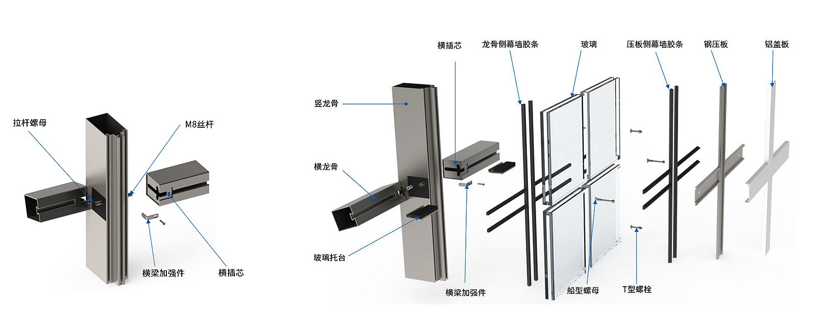 该幕墙结构集我司经典产品TBQ-70A与TBQ-60B系统优势于一体:继续延用并优化TBQ-60B系统优势的内扩拉锚结构,使钢压板与型材连接的螺栓组结构槽口及密封胶条安装槽口均在内扩台阶式结构的功能面完成,并直接将螺栓组结构槽口体现在TBQ-70A系统优势的凸台上,保留TBQ-70A系统中玻璃直接承重于凸台结构的便捷安装功能。