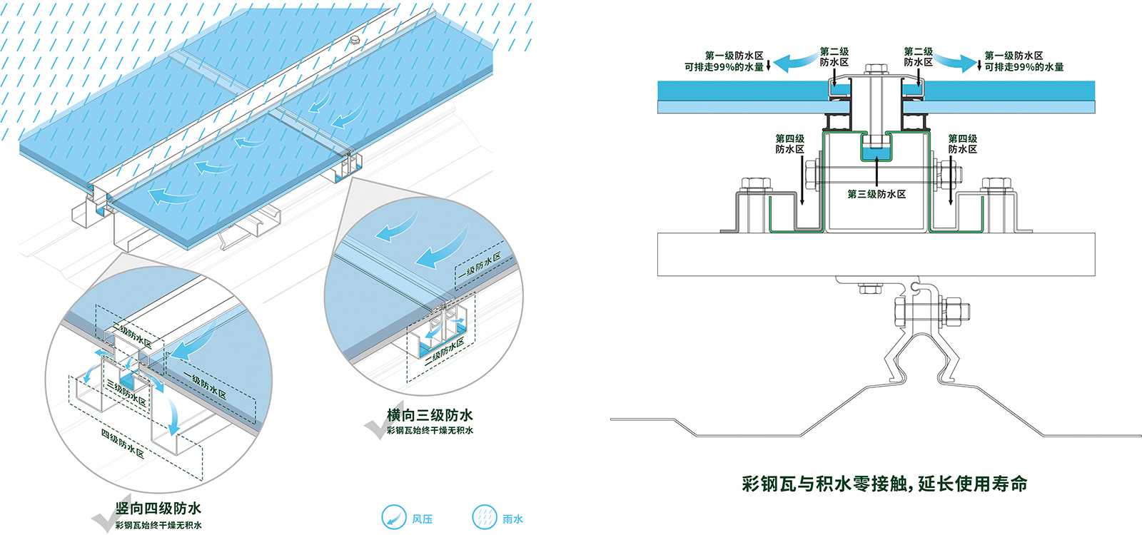 ● 动态水密性:等级3级,风速40m/s(相当于13级飓风),雨量240L/㎡·h(大暴雨到特大暴雨),压力为1000Pa(13级飓风对屋面系统的超大风压);