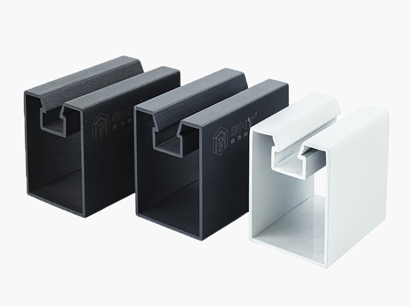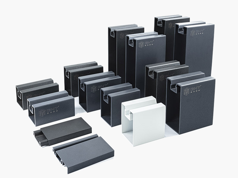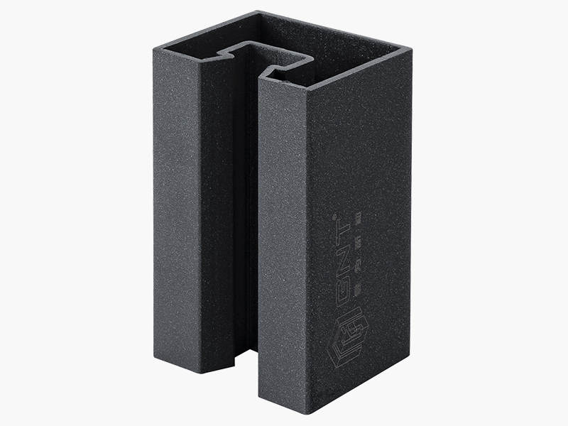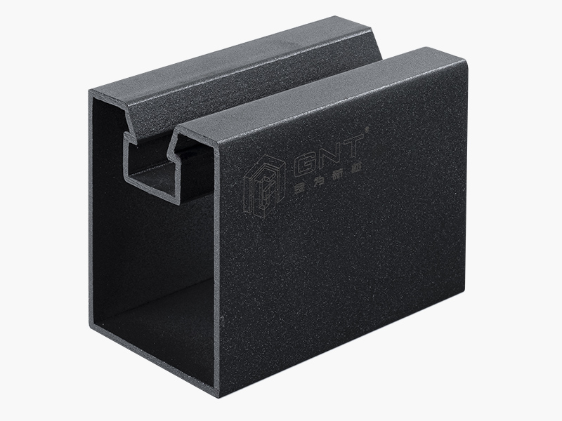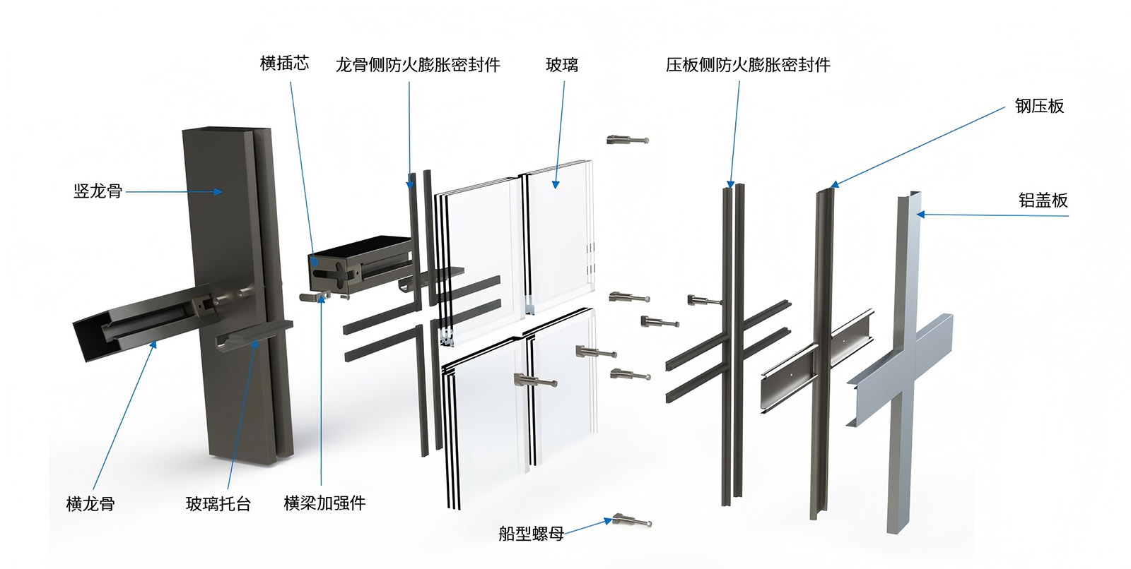 该幕墙框架系统为内扩台阶式拉铆结构,可实现框架层压式集约装配,具有很好的抗风压与防火隔热性能,且通过连接件与内扩台阶式拉铆结构的巧妙设计,实现幕墙系统的无孔、无损装配,大大降低了施工难度,并可实现断桥隔热及隐框设计。