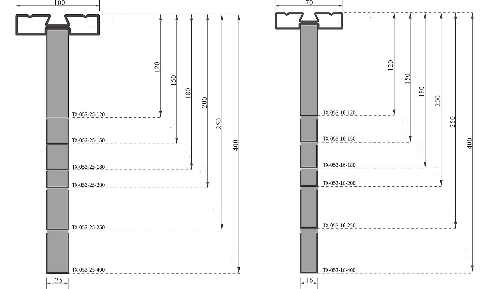 25*150、25*180、25*200、25*250、25*40016*120、16*150、16*180、16*200、16*250、16*400