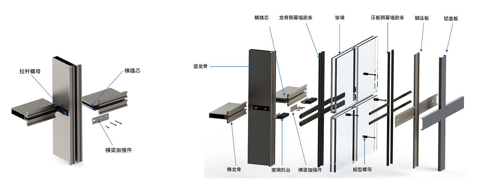 该幕墙框架系统主型材突破以往产品四方型截面局限:近似T型钢结构的外观,保留并升级了TBQ-60D的功能面优势-设置结构功能无损安装的内扩槽口,满足幕墙中连接构件要求,符合型材槽口和玻璃面板尺寸配合要求,保证幕墙系统的荷载要求其立面设计尺寸为210mm,同时使型材后部看面宽度仅为28mm,衬托在商业体、公共区域建筑的大跨度大通透玻璃幕墙及隔断,充分展示出色的纤细美感,实现功能、力学、美学的结合。